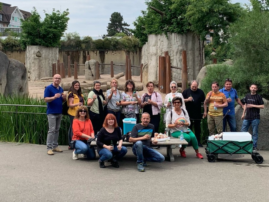Nach der Führung durch das Affenhaus im Basler Zolli genossen wir den Apéro vor dem Elefantenhaus. Anschliessend konnte der Zolli individuell besichtigt werden bevor wir uns am Ausgang wieder besammelten. Nach einem Zollicornet ging es gestärkt in die Stadt zum Restaurant Gifthüttli, wo wir den Abend gemütlich ausklingen liessen.